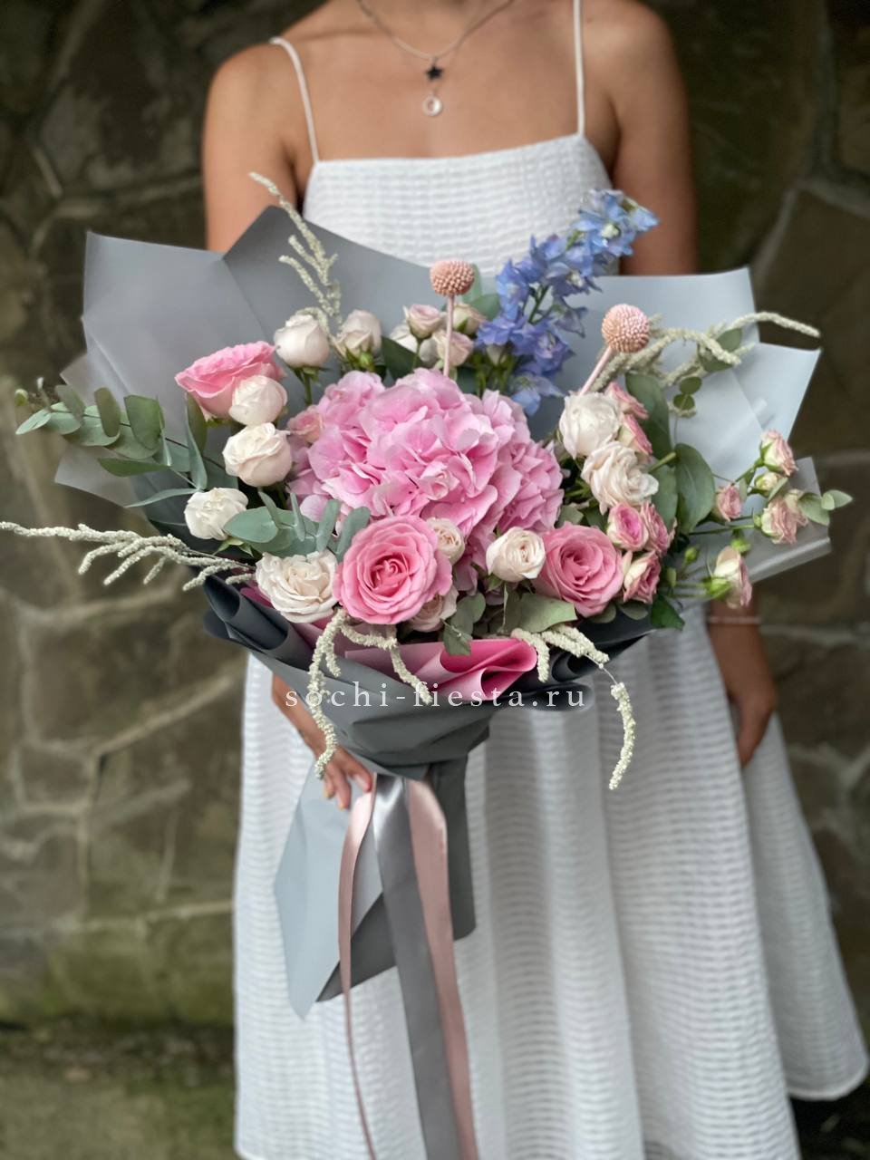 гортензия, эустома, белые французские розы, эвкалипт, авторское оформление.