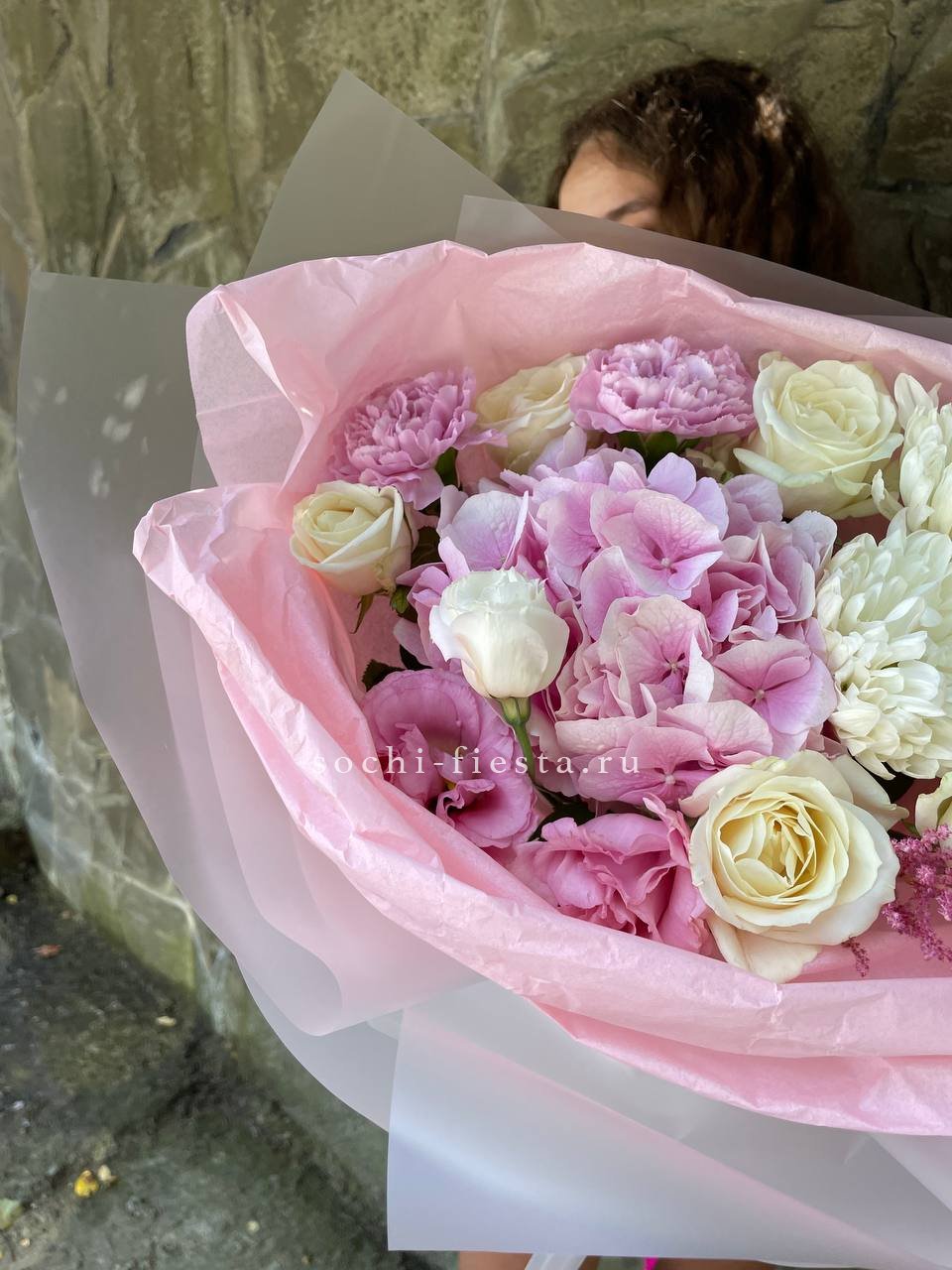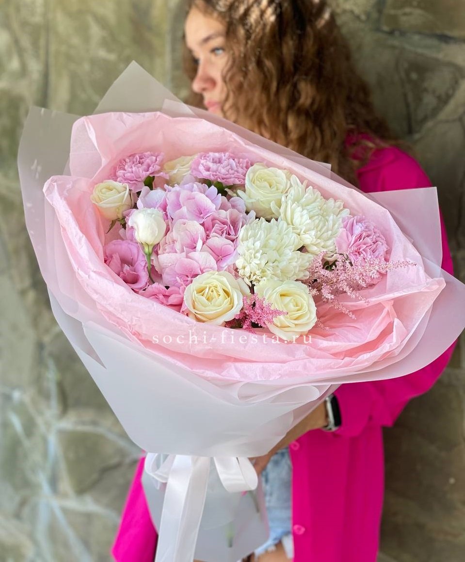 гортензия, розы, диантусы, хризантема, пионы (или пионовидные розы), эустома, корзина. Состав может меняться, в зависимости от сезона.