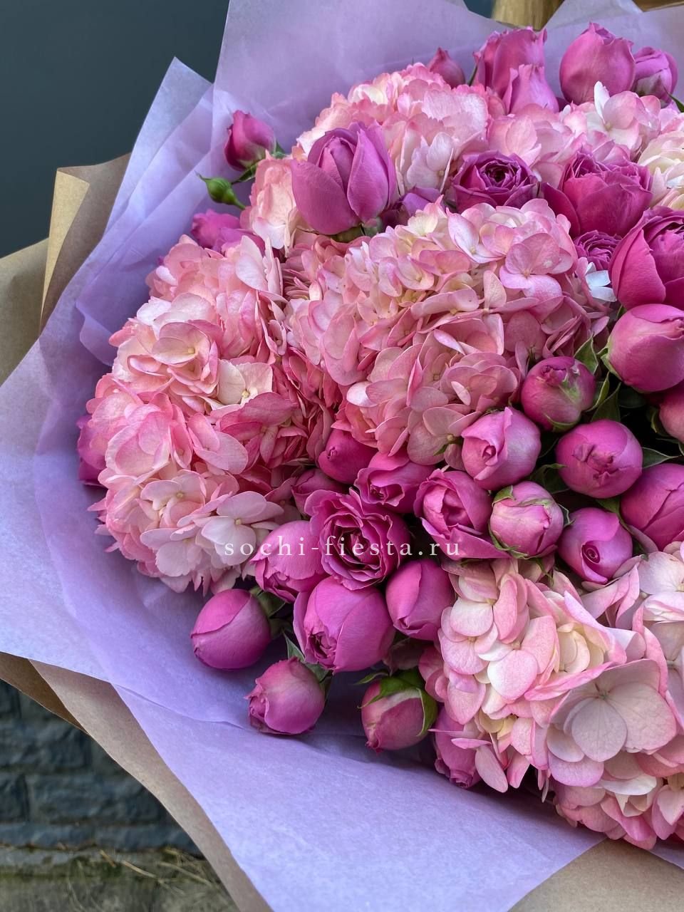 гортензия, пионовидная кустовая роза Мисти Баблс, лента, дизайнерская упаковка.