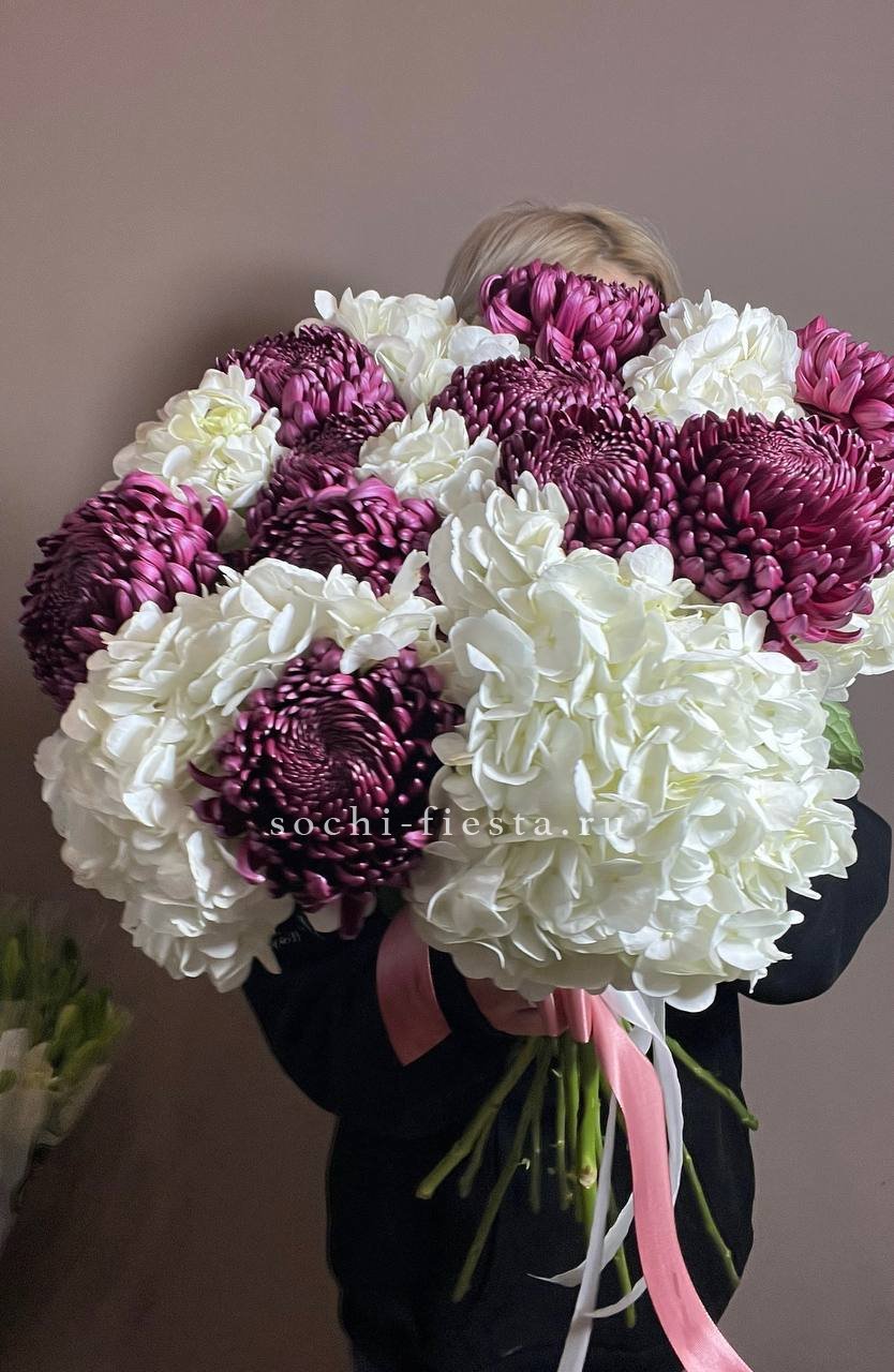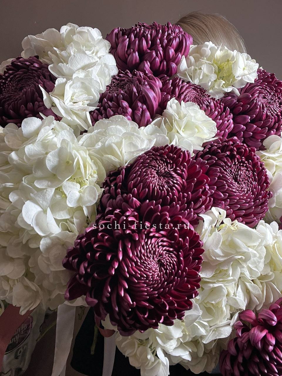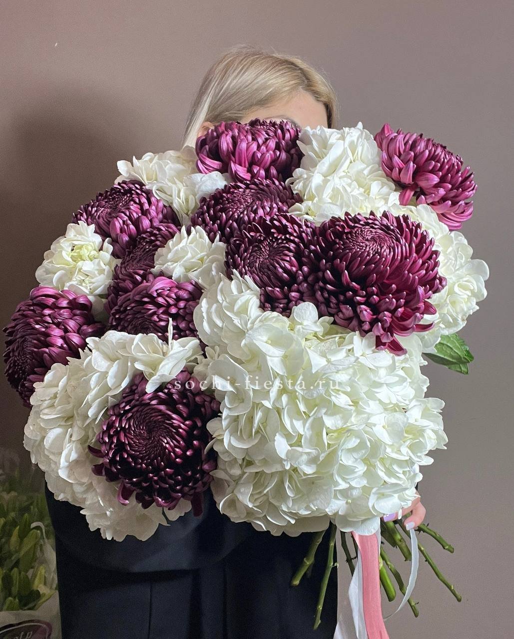 Белоснежные гортензии и розы Бигуди собраны в свободную охапку под атласную ленту. Щедрый объем и чистота линий создают ощущение легкости и простора.