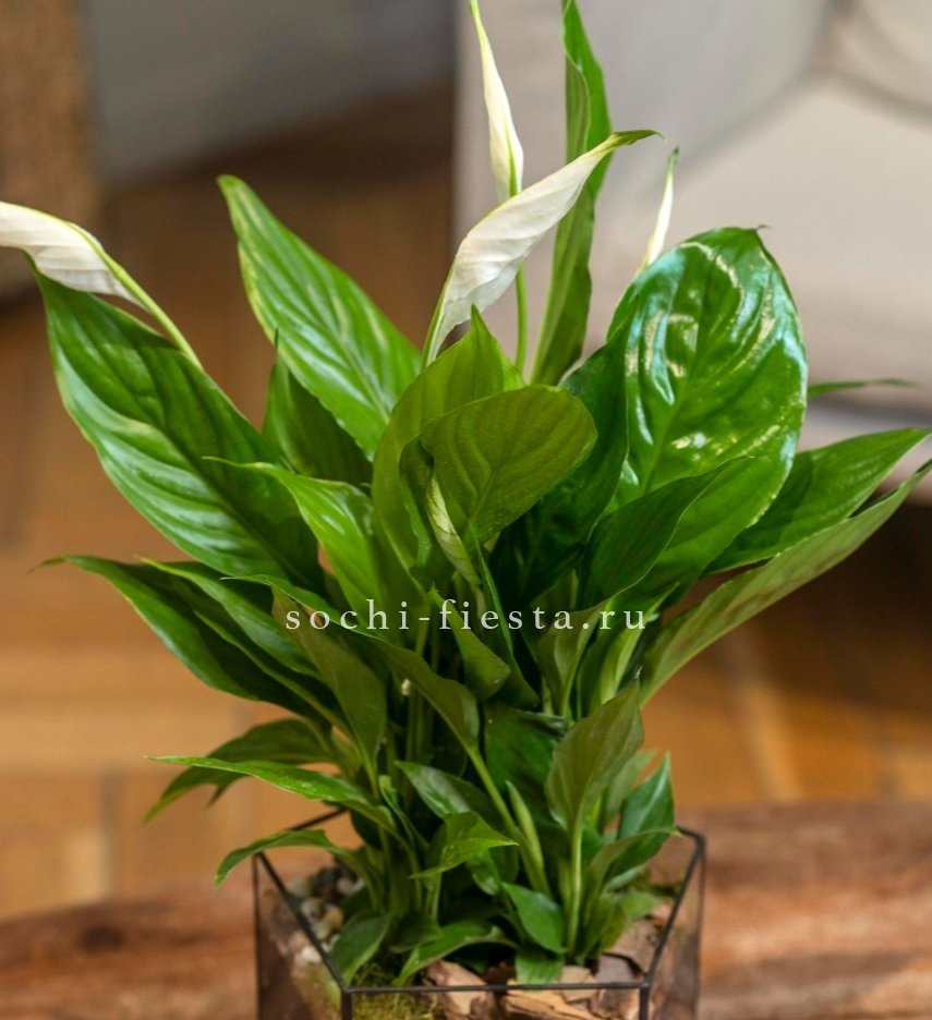 Спатифиллум в геометрическом кашпо с пятью гранями создает графичный акцент в интерьере. Живая зелень требует минимум внимания и долго сохраняет свежесть.